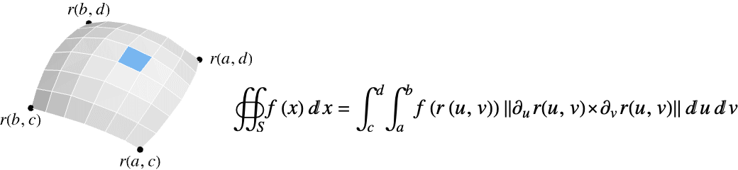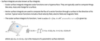 is the measure of a parametric surface element. - The scalar surface integral of f over a hypersurface