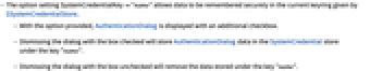 - Dismissing the dialog with the box checked will store AuthenticationDialog data in the SystemCredential store under the key "name".
