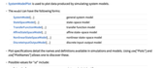 SystemModel[…] general system model StateSpaceModel[…] state-space model TransferFunctionModel[…] transfer function model AffineStateSpaceModel[…] affine state-space model NonlinearStateSpaceModel[…] nonlinear state-space model DiscreteInputOutputModel[…] discrete input-output model - Plot specifications detail the names and definitions available in simulations and models. Using sim["Plots"] and sim["PlotNames"] allows one to discover these.