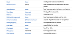 AlignmentPoint Center the default point in the graphic to align with AspectRatio 1/GoldenRatio ratio of height to width Axes True whether to draw axes AxesLabel Automatic indicate units on axis AxesOrigin Automatic where axes should cross AxesStyle {} style specifications for the axes Background None background color for the plot BaselinePosition Automatic how to align with a surrounding text baseline BaseStyle {} base style specifications for the graphic ClippingStyle None what to draw when lines are clipped ColorFunction Automatic how to determine the coloring of lines ColorFunctionScaling True whether to scale arguments to ColorFunction ContentSelectable Automatic whether to allow contents to be selected CoordinatesToolOptions Automatic detailed behavior of the coordinates tool DataRange Automatic the range of x values to assume for data Epilog {} primitives rendered after the main plot Filling None filling under each line FillingStyle Automatic style to use for filling FormatType TraditionalForm the default format type for text Frame False whether to put a frame around the plot FrameLabel None frame labels FrameStyle {} style specifications for the frame FrameTicks Automatic frame ticks FrameTicksStyle {} style specifications for frame ticks GridLines None grid lines to draw GridLinesStyle {} style specifications for grid lines ImageMargins 0. the margins to leave around the graphic ImagePadding All what extra padding to allow for labels etc. ImageSize Automatic the absolute size at which to render the graphic InterpolationOrder None the polynomial degree of curves used in joining data points IntervalMarkers Automatic how to render uncertainty IntervalMarkersStyle Automatic style for uncertainty elements LabelingFunction Automatic how to label points LabelingSize Automatic maximum size of callouts and labels LabelStyle {} style specifications for labels MaxPlotPoints Infinity the maximum number of points to include Mesh None mesh points to draw on each line MeshFunctions {#1&} how to determine the placement of mesh points MeshShading None how to shade regions between mesh points MeshStyle Automatic the style for mesh points Method Automatic methods to use MultiaxisArrangement None how to arrange multiple axes for data PerformanceGoal $PerformanceGoal aspects of performance to try to optimize PlotHighlighting Automatic highlighting effect for points PlotLabel None overall label for the plot PlotLabels None labels for data PlotLayout "Overlaid" how to position data PlotLegends Automatic use variable names vi PlotMarkers None markers to use to indicate each point PlotRange Automatic range of values to include PlotRangeClipping True whether to clip at the plot range PlotRangePadding Automatic how much to pad the range of values PlotRegion Automatic the final display region to be filled PlotStyle Automatic graphics directives to determine the style of each line PlotTheme $PlotTheme overall theme for the plot PreserveImageOptions Automatic whether to preserve image options when displaying new versions of the same graphic ProgressReporting $ProgressReporting control display of progress Prolog {} primitives rendered before the main plot RotateLabel True whether to rotate y labels on the frame ScalingFunctions Automatic how to scale individual coordinates TargetUnits Automatic plot in display units from model Ticks Automatic axes ticks TicksStyle {} style specifications for axes ticks