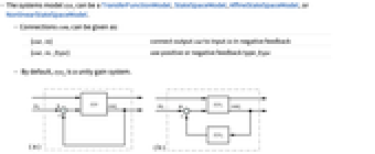 {out,in} connect output out to input in in negative feedback {out,in,ftype} use positive or negative feedback type ftype - By default, sys2 is a unity gain system.