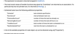"EvaluationExpression" expression to evaluate when the task is executed "EvaluationResult" result of evaluating the task expression "EventData" the most recent values of all handler functions keys "HandlerFunctions" handlers specified by the HandlerFunctions option "HandlerFunctionsKeys" handler functions keys specified by HandlerFunctionsKeys "TaskEnvironment" "Session", "Local", "Cloud" or "External" "TaskStatus" status of the task ("Running", "Waiting", etc.) "TaskType" type of task ("Immediate", "Scheduled", etc.) "TaskUUID" unique task identifier - The expression to evaluate is returned wrapped in HoldForm.