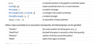 {x,y} an absolute position in the graphics coordinate system Scaled[{x,y}] scaled coordinates from 0 to 1 in each direction Rectangle[…] an explicit rectangle Rectangle[Scaled[…],Scaled[…]] a rectangle in the scaled coordinates Rotate[Rectangle[…],…] a rotated rectangle <|prop1val1,…|> an association of step properties - When a step is provided as an association of properties, the following keys can be specified: