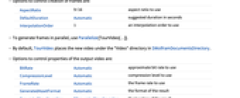 BitRate Automatic approximate bit rate to use CompressionLevel Automatic compression level to use FrameRate Automatic the frame rate to use GeneratedAssetFormat Automatic the format of the result GeneratedAssetLocation $GeneratedAssetLocation the location of the result OverwriteTarget False whether to overwrite an existing file RasterSize Automatic raster size of the output video VideoEncoding Automatic video encoding to use VideoTransparency False whether the output video should have a transparency channel