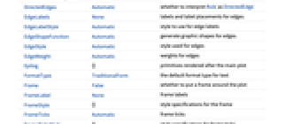 AlignmentPoint Center the default point in the graphic to align with AnnotationRules {} annotations for graph, edges and vertices AspectRatio Automatic ratio of height to width Axes False whether to draw axes AxesLabel None axes labels AxesOrigin Automatic where axes should cross AxesStyle {} style specifications for the axes Background None background color for the plot BaselinePosition Automatic how to align with a surrounding text baseline BaseStyle {} base style specifications for the graphic ContentSelectable Automatic whether to allow contents to be selected CoordinatesToolOptions Automatic detailed behavior of the coordinates tool DirectedEdges Automatic whether to interpret Rule as DirectedEdge EdgeLabels None labels and label placements for edges EdgeLabelStyle Automatic style to use for edge labels EdgeShapeFunction Automatic generate graphic shapes for edges EdgeStyle Automatic style used for edges EdgeWeight Automatic weights for edges Epilog {} primitives rendered after the main plot FormatType TraditionalForm the default format type for text Frame False whether to put a frame around the plot FrameLabel None frame labels FrameStyle {} style specifications for the frame FrameTicks Automatic frame ticks FrameTicksStyle {} style specifications for frame ticks GraphHighlight {} graph elements to highlight GraphHighlightStyle Automatic style for highlight GraphLayout Automatic how to lay out vertices and edges GridLines None grid lines to draw GridLinesStyle {} style specifications for grid lines ImageMargins 0. the margins to leave around the graphic ImagePadding All what extra padding to allow for labels etc. ImageSize Automatic the absolute size at which to render the graphic LabelStyle {} style specifications for labels Method Automatic details of graphics methods to use PerformanceGoal Automatic aspects of performance to try to optimize PlotLabel None an overall label for the plot PlotRange All range of values to include PlotRangeClipping False whether to clip at the plot range PlotRangePadding Automatic how much to pad the range of values PlotRegion Automatic the final display region to be filled PlotTheme $PlotTheme overall theme for the graph PreserveImageOptions Automatic whether to preserve image options when displaying new versions of the same graphic Prolog {} primitives rendered before the main plot RotateLabel True whether to rotate y labels on the frame Ticks Automatic axes ticks TicksStyle {} style specifications for axes ticks VertexCoordinates Automatic coordinates for vertices VertexLabels None labels and placements for vertices VertexLabelStyle Automatic style to use for vertex labels VertexShape Automatic graphic shape for vertices VertexShapeFunction Automatic generate graphic shapes for vertices VertexSize Medium size of vertices VertexStyle Automatic styles for vertices VertexWeight Automatic weights for vertices