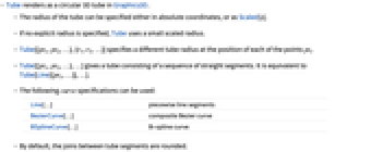 Line[…] piecewise line segments BezierCurve[…] composite Bezier curve BSplineCurve[…] B-spline curve - By default, the joins between tube segments are rounded.