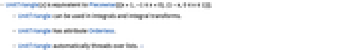 - UnitTriangle[x] is equivalent to Piecewise[{{x+1,-1≤x<0},{1-x,0≤x≤1}}].