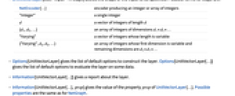 NetEncoder[…] encoder producing an integer or array of integers "Integer" a single integer d a vector of integers of length d {d1,d2,…} an array of integers of dimensions d1×d2×… "Varying" a vector of integers whose length is variable {"Varying",d2,d3,…} an array of integers whose first dimension is variable and remaining dimensions are d2×d3×… - Options[UnitVectorLayer] gives the list of default options to construct the layer. Options[UnitVectorLayer[…]] gives the list of default options to evaluate the layer on some data.