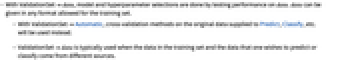 - With ValidationSetdata, model and hyperparameter selections are done by testing performance on data. data can be given in any format allowed for the training set.