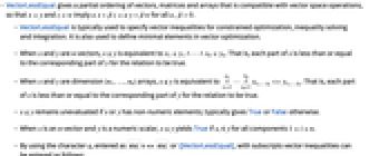 . - VectorLessEqual is typically used to specify vector inequalities for constrained optimization, inequality solving and integration. It is also used to define minimal elements in vector optimization.