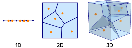 - The cells will be intervals in 1D, convex polygons in 2D and convex polyhedra in 3D.