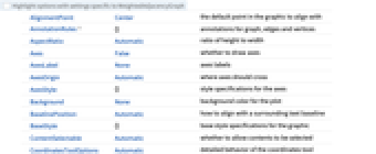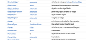 AlignmentPoint Center the default point in the graphic to align with AnnotationRules {} annotations for graph, edges and vertices AspectRatio Automatic ratio of height to width Axes False whether to draw axes AxesLabel None axes labels AxesOrigin Automatic where axes should cross AxesStyle {} style specifications for the axes Background None background color for the plot BaselinePosition Automatic how to align with a surrounding text baseline BaseStyle {} base style specifications for the graphic ContentSelectable Automatic whether to allow contents to be selected CoordinatesToolOptions Automatic detailed behavior of the coordinates tool DirectedEdges Automatic whether to interpret Rule as DirectedEdge EdgeLabels None labels and label placements for edges EdgeLabelStyle Automatic style to use for edge labels EdgeShapeFunction Automatic generate graphic shapes for edges EdgeStyle Automatic style used for edges EdgeWeight Automatic weights for edges Epilog {} primitives rendered after the main plot FormatType TraditionalForm the default format type for text Frame False whether to put a frame around the plot FrameLabel None frame labels FrameStyle {} style specifications for the frame FrameTicks Automatic frame ticks FrameTicksStyle {} style specifications for frame ticks GraphHighlight {} graph elements to highlight GraphHighlightStyle Automatic style for highlight GraphLayout Automatic how to lay out vertices and edges GridLines None grid lines to draw GridLinesStyle {} style specifications for grid lines ImageMargins 0. the margins to leave around the graphic ImagePadding All what extra padding to allow for labels etc. ImageSize Automatic the absolute size at which to render the graphic LabelStyle {} style specifications for labels Method Automatic details of graphics methods to use PerformanceGoal Automatic aspects of performance to try to optimize PlotLabel None an overall label for the plot PlotRange All range of values to include PlotRangeClipping False whether to clip at the plot range PlotRangePadding Automatic how much to pad the range of values PlotRegion Automatic the final display region to be filled PlotTheme $PlotTheme overall theme for the graph PreserveImageOptions Automatic whether to preserve image options when displaying new versions of the same graphic Prolog {} primitives rendered before the main plot RotateLabel True whether to rotate y labels on the frame Ticks Automatic axes ticks TicksStyle {} style specifications for axes ticks VertexCoordinates Automatic coordinates for vertices VertexLabels None labels and placements for vertices VertexLabelStyle Automatic style to use for vertex labels VertexShape Automatic graphic shape for vertices VertexShapeFunction Automatic generate graphic shapes for vertices VertexSize Medium size of vertices VertexStyle Automatic styles for vertices VertexWeight Automatic weights for vertices