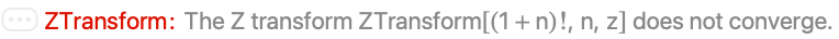 Assumptions $Assumptions assumptions to make about parameters GenerateConditions False whether to generate answers that involve conditions on parameters Method Automatic method to use VerifyConvergence True whether to verify convergence - In TraditionalForm, ZTransform is output using .