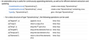 CreateDataStructure[ "DynamicArray"] create a new empty "DynamicArray" CreateDataStructure[ "DynamicArray",elems] create a new "DynamicArray" containing elems Typed[x,"DynamicArray"] give x the type "DynamicArray" - For a data structure of type "DynamicArray", the following operations can be used: