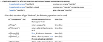CreateDataStructure["HashSet"] create a new empty "HashSet" CreateDataStructure["HashSet",elems] create a new "HashSet" containing elems Typed[x,"HashSet"] give x the type "HashSet" - For a data structure of type "HashSet", the following operations can be used: