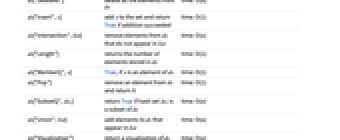 ds["Complement",list] remove elements from ds that appear in list time: O(n) ds["Copy"] return a copy of ds time: O(n) ds["Elements"] return a list of the elements of ds time: O(n) ds["EmptyQ"] True, if ds has no elements time: O(1) ds["Delete",x] delete x from ds, return True if x was actually an element time: O(1) ds["DeleteAll"] delete all the elements from ds time: O(n) ds["Insert",x] add x to the set and return True if addition succeeded time: O(1) ds["Intersection",list] remove elements from ds that do not appear in list time: O(n) ds["Length"] returns the number of elements stored in ds time: O(1) ds["MemberQ",x] True, if x is an element of ds time: O(1) ds["Pop"] remove an element from ds and return it time: O(1) ds["SubsetQ",ds1] return True if hash set ds1 is a subset of ds time: O(n) ds["Union",list] add elements to ds that appear in list time: O(n) ds["Visualization"] return a visualization of ds time: O(n) - The following functions are also supported: