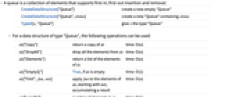 CreateDataStructure["Queue"] create a new empty "Queue" CreateDataStructure["Queue",elems] create a new "Queue" containing elems Typed[x,"Queue"] give x the type "Queue" - For a data structure of type "Queue", the following operations can be used: