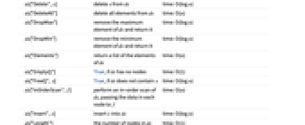 ds["BreadthFirstScan",f] perform a breadth-first scan of ds, passing the data in each node to f time: O(n) ds["Copy"] return a copy of ds time: O(n) ds["Delete",x] delete x from ds time: O(log n) ds["DeleteAll"] delete all elements from ds time: O(n) ds["DropMax"] remove the maximum element of ds and return it time: O(log n) ds["DropMin"] remove the minimum element of ds and return it time: O(log n) ds["Elements"] return a list of the elements of ds time: O(n) ds["EmptyQ"] True, if ds has no nodes time: O(1) ds["FreeQ",x] True, if ds does not contain x time: O(log n) ds["InOrderScan",f] perform an in-order scan of ds, passing the data in each node to f time: O(n) ds["Insert",x] insert x into ds time: O(log n) ds["Length"] the number of nodes in ds time: O(1) ds["Max"] return the maximum element of ds time: O(log n) ds["MemberQ",x] True, if ds contains x time: O(log n) ds["Min"] return the minimum element of ds time: O(log n) ds["PostOrderScan",f] perform a post-order scan of ds, passing the data in each node to f time: O(n) ds["PreOrderScan",f] perform a pre-order scan of ds, passing the data in each node to f time: O(n) ds["Visualization"] return a visualization of ds time: O(n) - The following functions are also supported: