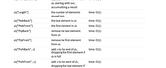 ds["Capacity"] the maximum number of elements that can be stored in ds time: O(1) ds["Copy"] return a copy of ds time: O(n) ds["DropAll"] drop all the elements from ds time: O(n) ds["Elements"] return a list of the elements of ds time: O(n) ds["EmptyQ"] True, if ds has no elements time: O(1) ds["Fold",fun,init] apply fun to the elements of ds, starting with init, accumulating a result time: O(n) ds["Length"] the number of elements stored in ds time: O(1) ds["PeekBack"] the last element in ds time: O(1) ds["PeekFront"] the first element in ds time: O(1) ds["PopBack"] remove the last element from ds time: O(1) ds["PopFront"] remove the first element from ds time: O(1) ds["PushBack",x] add x to the end of ds, dropping the first element if ds is full time: O(1) ds["PushFront",x] add x to the start of ds, dropping the last element if ds is full time: O(1) ds["Visualization"] return a visualization of ds time: O(n) - The following functions are also supported: