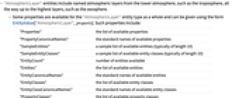 "Properties" the list of available properties "PropertyCanonicalNames" the standard names of available properties "SampleEntities" a sample list of available entities (typically of length 10) "SampleEntityClasses" a sample list of available entity classes (typically of length 10) "EntityCount" number of entities available "Entities" the list of available entities "EntityCanonicalNames" the standard names of available entities "EntityClasses" the list of available entity classes "EntityClassCanonicalNames" the standard names of available entity classes "PropertyClasses" the list of available property classes "PropertyClassCanonicalNames" the standard names of available property classes "PropertyCount" number of properties available - The following annotations can be used in the third argument of EntityValue["AtmosphericLayer",property,annotation]:
