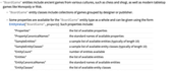 "Properties" the list of available properties "PropertyCanonicalNames" the standard names of available properties "SampleEntities" a sample list of available entities (typically of length 10) "SampleEntityClasses" a sample list of available entity classes (typically of length 10) "EntityCount" number of entities available "Entities" the list of available entities "EntityCanonicalNames" the standard names of available entities "EntityClasses" the list of available entity classes "EntityClassCanonicalNames" the standard names of available entity classes "PropertyClasses" the list of available property classes "PropertyClassCanonicalNames" the standard names of available property classes "PropertyCount" number of properties available - The following annotations can be used in the third argument of EntityValue["BoardGame",property,annotation]: