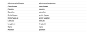 AdministrativeDivision administrative division Coordinates coordinates Country country Elevation elevation EntityClasses entity classes EntityTypeList entity type list Latitude latitude Longitude longitude Name name Position position