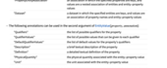 "Qualifiers" the list of possible qualifiers for the property "QualifierValues" the list of possible values that can be given to each qualifier "DefaultQualifierValues" the list of default values for the property's qualifiers "Description" a brief textual description of the property "Definition" a detailed textual definition of the property "PhysicalQuantity" the physical quantity associated with the entity-property value "Unit" the unit associated with the entity-property value - A qualifier value of Automatic indicates that an applicable format of values can be used; e.g. for the "Date" qualifier, this includes a proper date or date span.