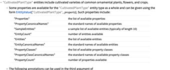 - Some properties are available for the "CultivatedPlantType" entity type as a whole and can be given using the form EntityValue["CultivatedPlantType",property]. Such properties include: