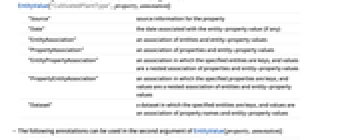 "Source" source information for the property "Date" the date associated with the entity-property value (if any) "EntityAssociation" an association of entities and entity-property values "PropertyAssociation" an association of properties and entity-property values "EntityPropertyAssociation" an association in which the specified entities are keys, and values are a nested association of properties and entity-property values "PropertyEntityAssociation" an association in which the specified properties are keys, and values are a nested association of entities and entity-property values "Dataset" a dataset in which the specified entities are keys, and values are an association of property names and entity-property values - The following annotations can be used in the second argument of EntityValue[property,annotation]: