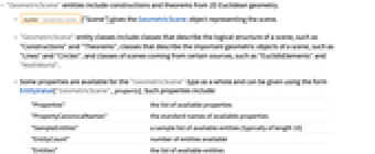 - Some properties are available for the "GeometricScene" type as a whole and can be given using the form EntityValue["GeometricScene",property]. Such properties include:
