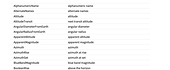 AlphanumericName alphanumeric name AlternateNames alternate names Altitude altitude AltitudeTransit next transit altitude AngularDiameterFromEarth angular diameter AngularRadiusFromEarth angular radius ApparentAltitude apparent altitude ApparentMagnitude apparent magnitude Azimuth azimuth AzimuthRise azimuth at rise AzimuthSet azimuth at set BlueBandMagnitude blue band magnitude BooleanRise above the horizon Classes classes Constellation constellation DailyTimeAboveHorizon daily time above horizon Declination declination Diameter average diameter DistanceFromEarth distance from Earth DistanceFromSun distance from Sun EntityClasses entity classes EntityTypeList entity type list GalacticLatitude galactic latitude GalacticLongitude galactic longitude GeocentricEclipticLatitude geocentric ecliptic latitude GeocentricEclipticLongitude geocentric ecliptic longitude GreenwichHourAngle Greenwich hour angle HeliocentricEclipticLatitude heliocentric ecliptic latitude HeliocentricEclipticLongitude heliocentric ecliptic longitude HelioCoordinates heliocentric ecliptic XYZ coordinates ICNumber IC number Image image LocalHourAngle local hour angle MajorAxis major axis MaximalAltitudeTime next maximum altitude time MinorAxis minor axis Name name NGCNumber NGC number ObjectType object type PositionAngle position angle RadialVelocity radial velocity Radius average radius Redshift redshift RightAscension right ascension RiseTime next rise SetTime next set SiderealHourAngle sidereal hour angle TransitTime next transit time VisualBandMagnitude visual band magnitude ZenithAngle zenith angle