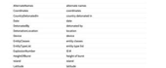 AlternateNames alternate names Coordinates coordinates CountryDetonatedIn country detonated in Date date DetonatedBy detonated by DetonationLocation location Device device EntityClasses entity classes EntityTypeList entity type list ExplosionNumber ID HeightOfBurst height of burst Island island Latitude latitude Longitude longitude Name name NuclearExplosionTestSite test site Ocean ocean Position position SeriesName operation name ShotName shot name TestType detonation type Yield yield