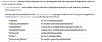 - "NuclearExplosion" entity classes include collections of explosions grouped by type, operation name and detonating country.