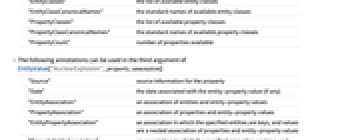 "Properties" the list of available properties "PropertyCanonicalNames" the standard names of available properties "SampleEntities" a sample list of available entities (typically of length 10) "SampleEntityClasses" a sample list of available entity classes (typically of length 10) "EntityCount" number of entities available "Entities" the list of available entities "EntityCanonicalNames" the standard names of available entities "EntityClasses" the list of available entity classes "EntityClassCanonicalNames" the standard names of available entity classes "PropertyClasses" the list of available property classes "PropertyClassCanonicalNames" the standard names of available property classes "PropertyCount" number of properties available - The following annotations can be used in the third argument of EntityValue["NuclearExplosion",property,annotation]: