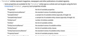 "Properties" the list of available properties "PropertyCanonicalNames" the standard names of available properties "SampleEntities" a sample list of available entities (typically of length 10) "SampleEntityClasses" a sample list of available entity classes (typically of length 10) "EntityCount" number of entities available "Entities" the list of available entities "EntityCanonicalNames" the standard names of available entities "EntityClasses" the list of available entity classes "EntityClassCanonicalNames" the standard names of available entity classes "PropertyClasses" the list of available property classes "PropertyClassCanonicalNames" the standard names of available property classes "PropertyCount" number of properties available - The following annotations can be used in the third argument of EntityValue["Periodical",property,annotation]: