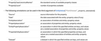 "Source" source information for the property "Date" the date associated with the entity-property value (if any) "EntityAssociation" an association of entities and entity-property values "PropertyAssociation" an association of properties and entity-property values "EntityPropertyAssociation" an association in which the specified entities are keys, and values are a nested association of properties and entity-property values "PropertyEntityAssociation" an association in which the specified properties are keys, and values are a nested association of entities and entity-property values "Dataset" a dataset in which the specified entities are keys, and values are an association of property names and entity-property values - The following annotations can be used in the second argument of EntityValue[property,annotation]: