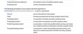"Source" source information for the property "Date" the date associated with the entity-property value (if any) "EntityAssociation" an association of entities and entity-property values "PropertyAssociation" an association of properties and entity-property values "EntityPropertyAssociation" an association in which the specified entities are keys, and values are a nested association of properties and entity-property values "PropertyEntityAssociation" an association in which the specified properties are keys, and values are a nested association of entities and entity-property values "Dataset" a dataset in which the specified entities are keys, and values are an association of property names and entity-property values - The following annotations can be used in the second argument of EntityValue[property,annotation]: