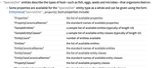 "Properties" the list of available properties "PropertyCanonicalNames" the standard names of available properties "SampleEntities" a sample list of available entities (typically of length 10) "SampleEntityClasses" a sample list of available entity classes (typically of length 10) "EntityCount" number of entities available "Entities" the list of available entities "EntityCanonicalNames" the standard names of available entities "EntityClasses" the list of available entity classes "EntityClassCanonicalNames" the standard names of available entity classes "PropertyClasses" the list of available property classes "PropertyClassCanonicalNames" the standard names of available property classes "PropertyCount" number of properties available - The following annotations can be used in the third argument of EntityValue["SpeciesDiet",property,annotation]: