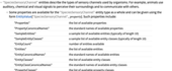 - "SpeciesSensoryChannel" entities describe the types of sensory channels used by organisms. For example, animals use auditory, chemical and visual signals to perceive their surroundings and to communicate with others.