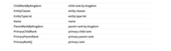 ChildRankByKingdom child rank by kingdom EntityClasses entity classes EntityTypeList entity type list Name name ParentRankByKingdom parent rank by kingdom PrimaryChildRank primary child rank PrimaryParentRank primary parent rank PrimaryRankQ primary rank