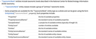 - "TaxonomicRank" entities include taxonomic levels described in the National Center for Biotechnology Information (NCBI) taxonomy.
