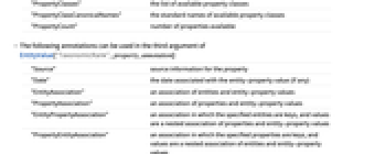 "Source" source information for the property "Date" the date associated with the entity-property value (if any) "EntityAssociation" an association of entities and entity-property values "PropertyAssociation" an association of properties and entity-property values "EntityPropertyAssociation" an association in which the specified entities are keys, and values are a nested association of properties and entity-property values "PropertyEntityAssociation" an association in which the specified properties are keys, and values are a nested association of entities and entity-property values "Dataset" a dataset in which the specified entities are keys, and values are an association of property names and entity-property values - The following annotations can be used in the second argument of EntityValue[property,annotation]: