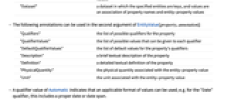 "Qualifiers" the list of possible qualifiers for the property "QualifierValues" the list of possible values that can be given to each qualifier "DefaultQualifierValues" the list of default values for the property's qualifiers "Description" a brief textual description of the property "Definition" a detailed textual definition of the property "PhysicalQuantity" the physical quantity associated with the entity-property value "Unit" the unit associated with the entity-property value - A qualifier value of Automatic indicates that an applicable format of values can be used; e.g. for the "Date" qualifier, this includes a proper date or date span.