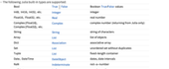 Bool True | False Boolean True/False values Int8, Int16, Int32, etc. Integer integer Float16, Float32, etc. Real real number Complex{Float16}, Complex{Float32}, etc. Complex complex number (returning from Julia only) String String string of characters Array List list of objects Dict Association associative array Set List unordered set without duplicates Tuple List fixed-length container Date, DateTime ![TemplateBox[{DateObject, paclet:ref/DateObject}, RefLink, BaseStyle -> {3ColumnTableMod}] TemplateBox[{DateObject, paclet:ref/DateObject}, RefLink, BaseStyle -> {3ColumnTableMod}]](Files/Julia.en/1.png)