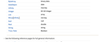 BSONObjectID object id Association object BSONDecimal128 high-precision number ByteArray binary data DateObject date Infinity max key Integer 64-bit integer List array Minus[Infinity] min key Null null Real double String string True,False Boolean - See the following reference pages for full general information: