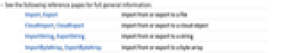Import, Export import from or export to a file CloudImport, CloudExport import from or export to a cloud object ImportString, ExportString import from or export to a string ImportByteArray, ExportByteArray import from or export to a byte array