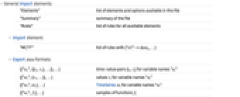 "Elements" list of elements and options available in this file "Summary" summary of the file "Rules" list of rules for all available elements - Import element: