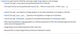 - The import format can be specified with Import["file","PNG"] or Import["file",{"PNG",elem,…}].