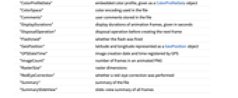 "AnimationRepetitions" how many times the animation is played before stopping "BitDepth" bits used to represent each color channel in the file "BlendOperation" whether to perform alpha blending to create the next frame "CameraTopOrientation" orientation of the camera when the picture was taken "Channels" the number of color channels used in the file "ColorMap" color reduction palette, given as a list of color values "ColorProfileData" embedded color profile, given as a ColorProfileData object "ColorSpace" color encoding used in the file "Comments" user comments stored in the file "DisplayDurations" display durations of animation frames, given in seconds "DisposalOperation" disposal operation before creating the next frame "FlashUsed" - whether the flash was fired