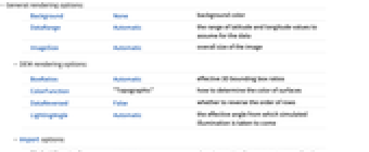 Background None background color DataRange Automatic the range of latitude and longitude values to assume for the data ImageSize Automatic overall size of the image - DEM rendering options: